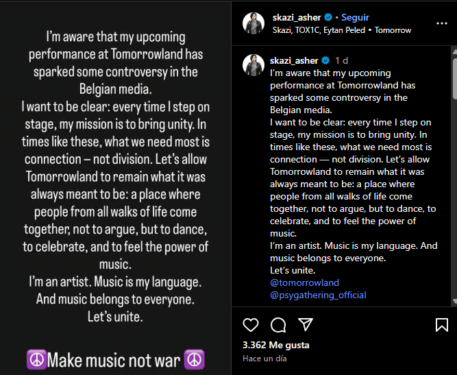 “Por motivos de seguridad y en línea con nuestro deseo de compartir únicamente amor a través de la música, mi participación en Tomorrowland ha sido cancelada”. Agregó que su prioridad es “crear un ambiente seguro y positivo para todos” y que siempre ha buscado transmitir valores de “unidad, alegría y respeto”.