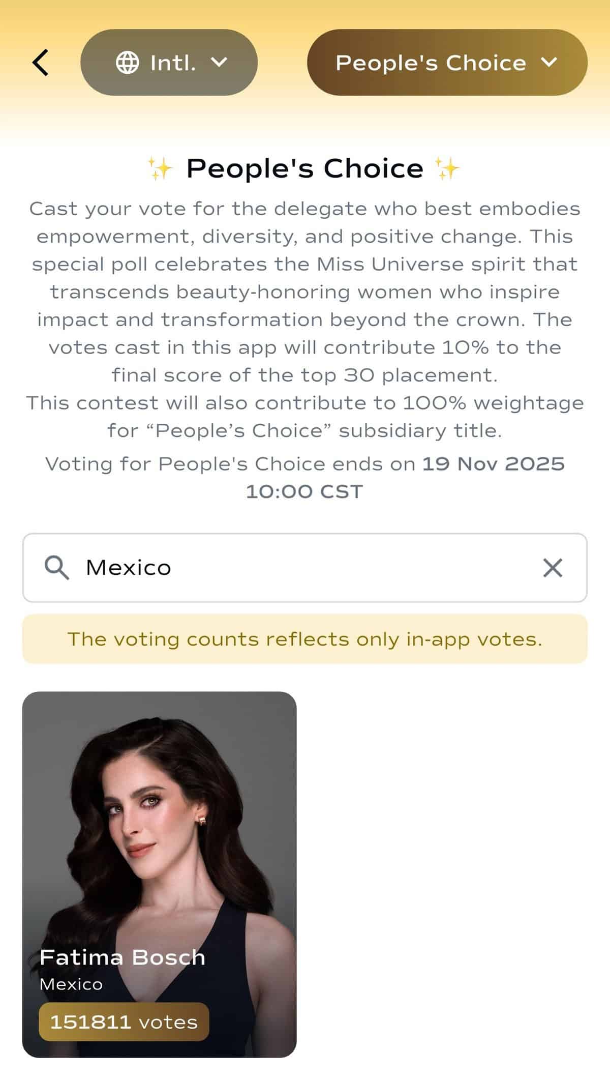 La edición 2025 de Miss Universo está por llegar a su cierre este 20 de noviembre, y los fans tienen la oportunidad de apoyar a Fátima Bosch, la representante de México, mediante la votación digital en la app oficial del certamen.