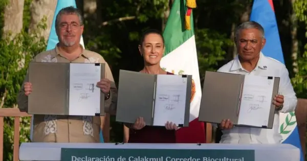 La Presidenta de México, Claudia Sheinbaum Pardo, firmó un acuerdo trilateral sin precedentes con sus homólogos de Guatemala, Bernardo Arévalo de León; y de Belice, John Antonio Briceño, para preservar 5.7 millones de hectáreas del corazón de Mesoamérica, a través de la creación de un nuevo Corredor Biocultural de la Gran Selva Maya.