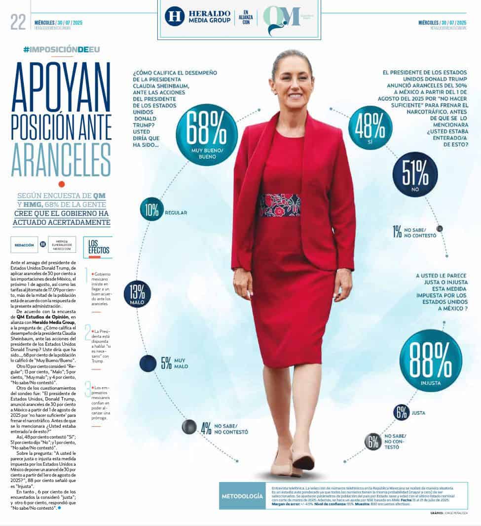 De acuerdo con la encuesta de Qm Estudios de Opinión, en alianza con Heraldo Media Group, a la pregunta de: ¿Cómo califica el desempeño del presidente Claudia Sheinbaum, ante las acciones del presidente de los Estados Unidos, Donald Trump? Usted diría que ha sido... 68 por ciento de la población lo calificó de “Muy Bueno/Bueno”.