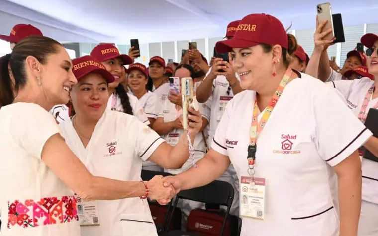 "Yo digo que es el programa más ambicioso de todo el mundo de atención y prevención a la salud y lo llevan a cabo las y los mejores de México, que son las y los enfermeros de nuestro país, la verdad, los médicos también, médicas, pero la verdad es que el trabajo que hacen las y los trabajadores de la salud, enfermeras, enfermeros es algo extraordinario y nosotros queremos que sean el centro de este programa y se van a volver famosos mundialmente porque vamos a presumir, dentro de muy pocos años, que somos el programa de prevención a la salud más importante de todo el mundo y que se va a notar en los índices", afirmó ante 500 médicas, médicos, enfermeras, enfermeros, servidores de la nación y derechohabientes que la acompañaron.