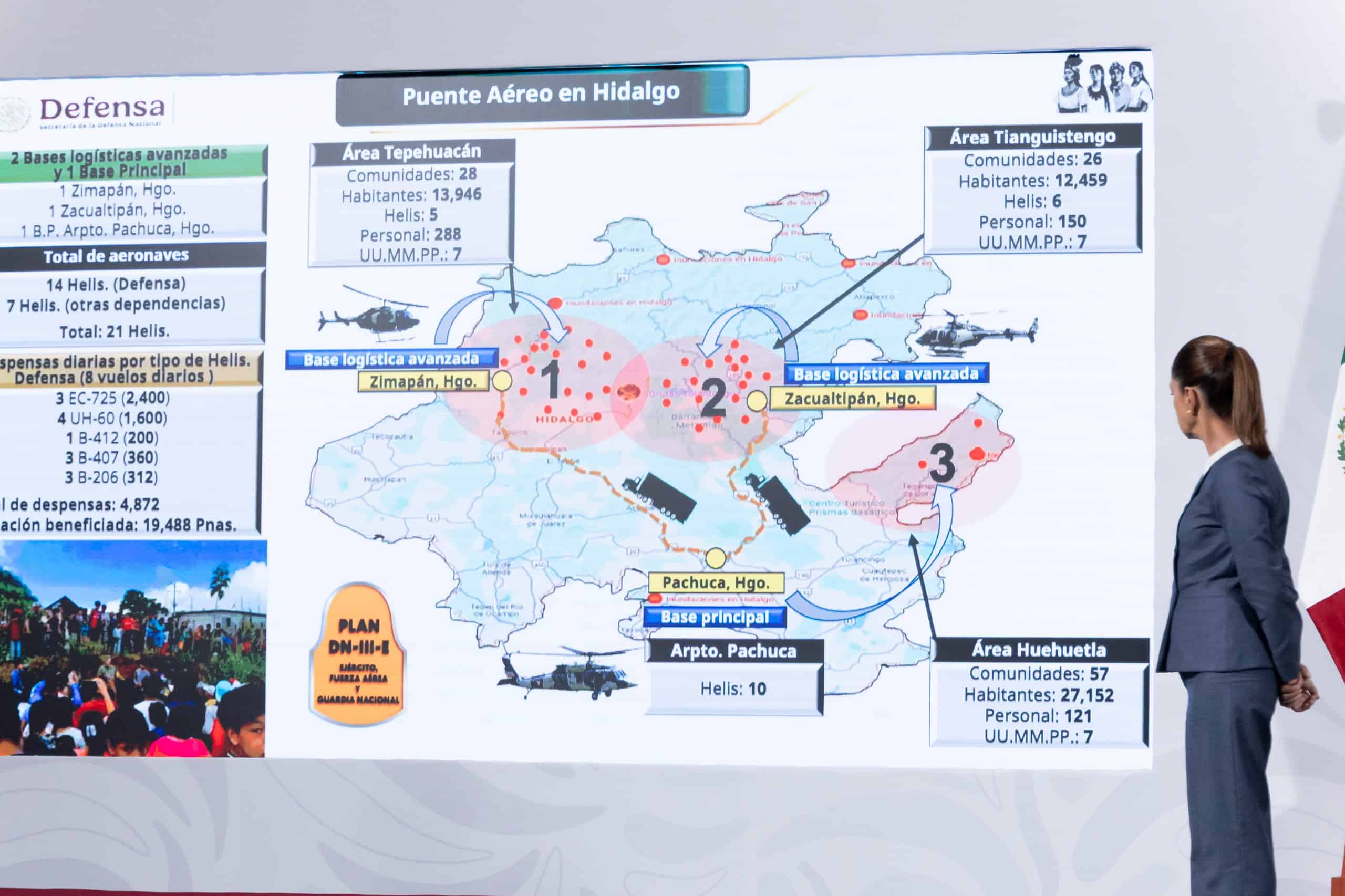 El Gobierno de México informa que, la Secretaría de la Defensa Nacional, activó en Hidalgo tres Centros de Mando con 111 puentes aéreos con 21 helicópteros: 14 aeronaves de la Defensa y siete de otras dependencias.