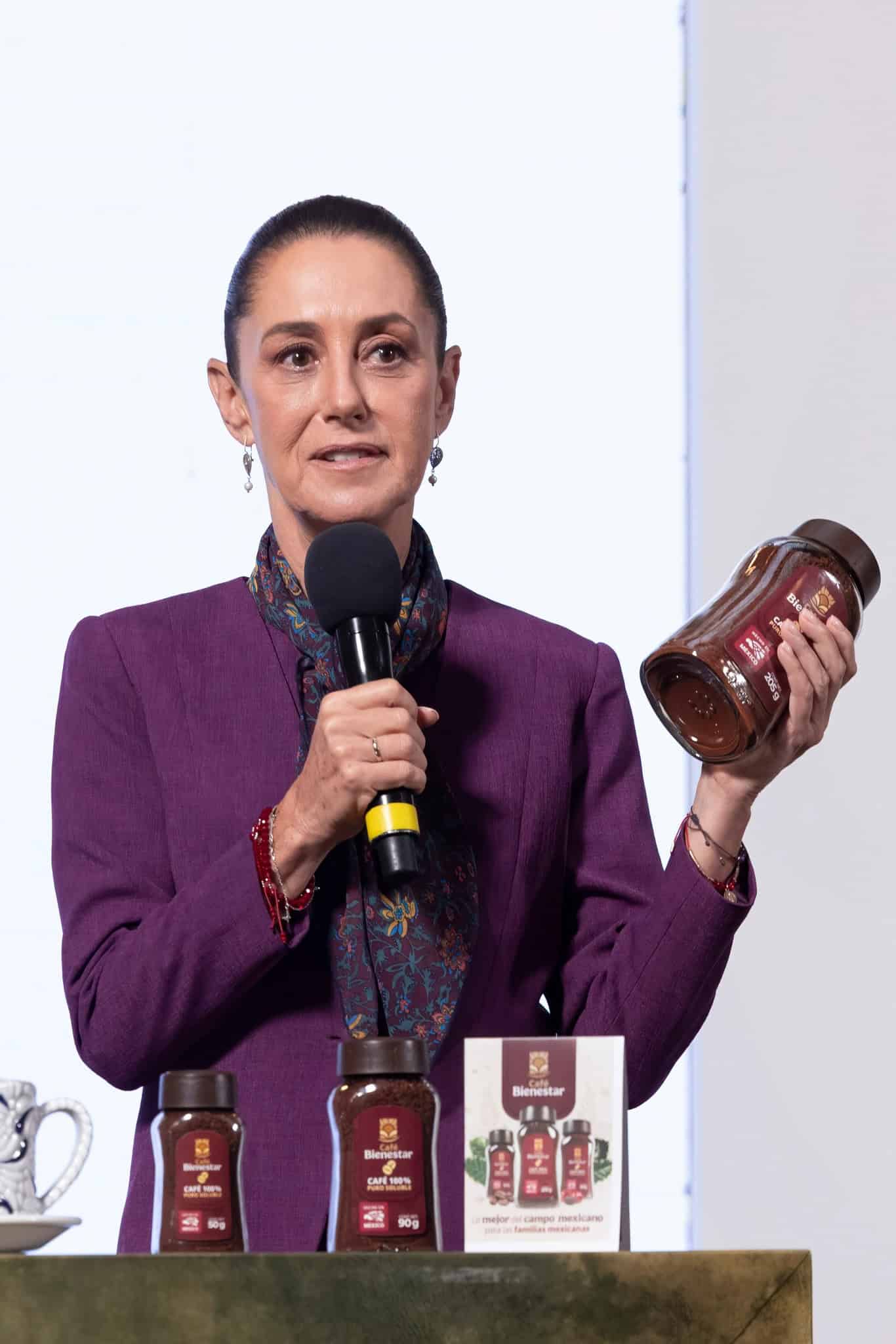 María Luisa Albores González, titular del programa Alimentación para el Bienestar, presentó el nuevo producto Café Bienestar, elaborado por 6,646 pequeños productores de café, en su mayoría provenientes de comunidades indígenas o con altos niveles de rezago social en Oaxaca, Puebla, Veracruz y Guerrero.