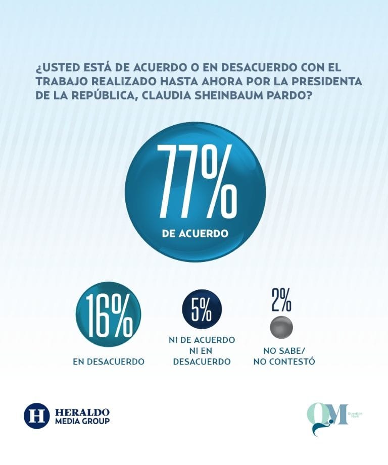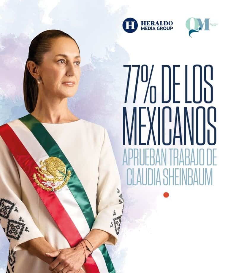 La presidenta Claudia Sheinbaum Pardo llegó a su onceavo mes de gobierno con amplia aceptación ciudadana a su trabajo, de acuerdo con la encuesta de QM Estudios de Opinión, en alianza con Heraldo Media Group.