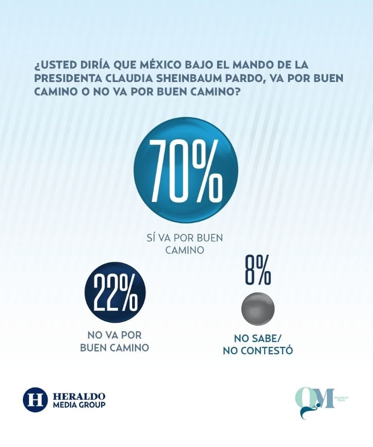 A la pregunta: "¿Usted diría que México bajo el mando de la presidenta Claudia Sheinbaum Pardo, va por buen camino o no va por buen camino?", 70% dijo que "sí vamos por buen camino"; 22%, que "no va por buen camino" y 8% "no sabe/no contestó".