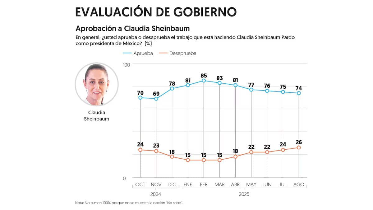 Aunque la aprobación general de Sheinbaum se ha mantenido relativamente estable —pasando de 77% en mayo a 74% en agosto—, su imagen personal ha mostrado un deterioro más notable.