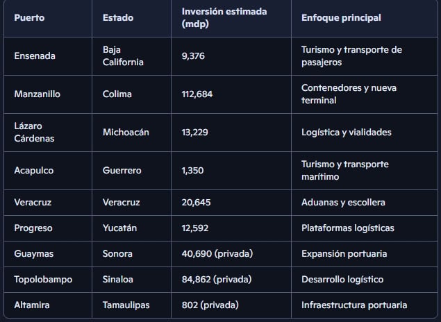 - Manzanillo-Cuyutlán: nuevo puerto con cinco terminales y conectividad carretera y ferroviaria