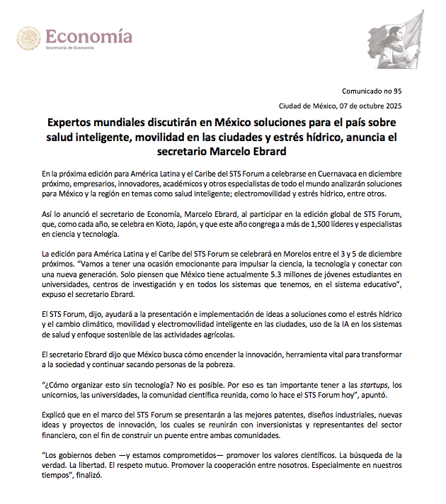 Este foro se celebrará en Cuernavaca, Morelos, del 3 al 5 de diciembre, como parte de la edición para América Latina y el Caribe del Science and Technology in Society (STS) Forum, una plataforma global que reúne a líderes, científicos, académicos, empresarios e innovadores para fomentar la cooperación tecnológica a nivel mundial.