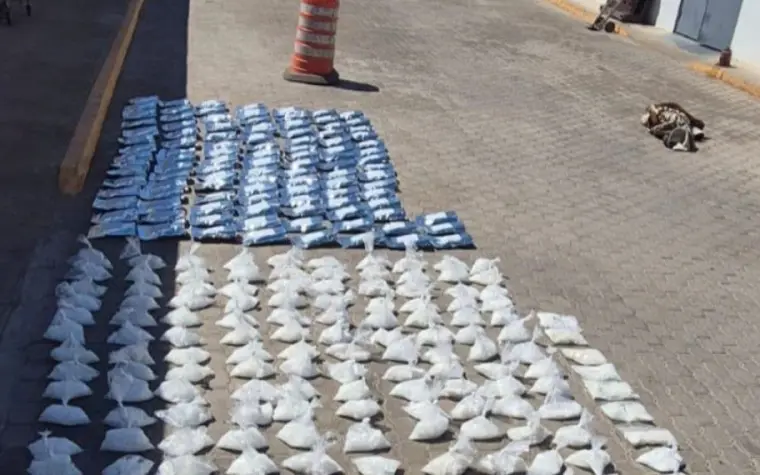 Luego de un registro minucioso, los agentes de seguridad hallaron 324 bolsas de metanfetamina, de las cuales 216 eran de plástico y 108 tenían un recubrimiento plateado, mismas que estaban ocultas debajo de unos colchones ubicados en la parte trasera de la unidad.