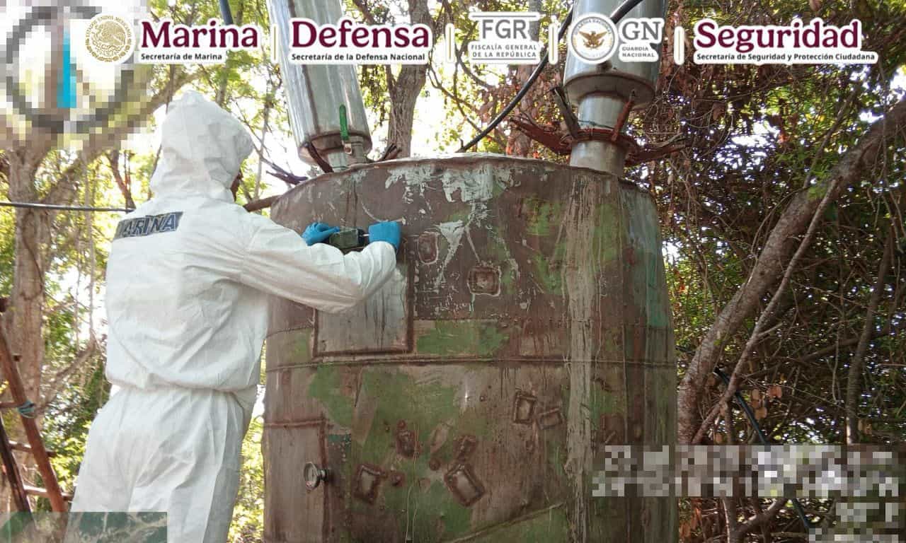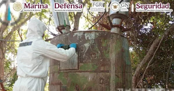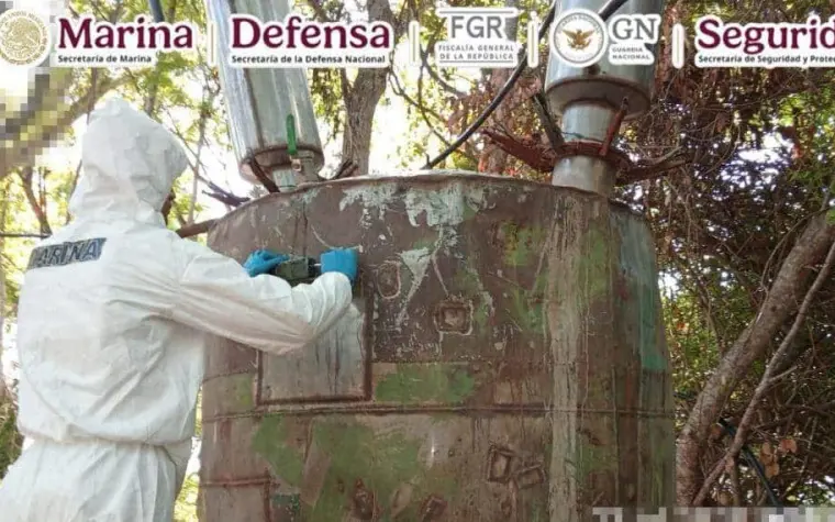 - Esta acción se llevó a cabo cuando elementos de la Armada de México, al realizar recorridos terrestres, localizaron dos laboratorios donde hallaron alrededor de 4,900 kilos de metanfetamina, 3,180 litros de sustancias químicas, seis reactores de 1,500 litros, cuatro reactores de 500 litros, 13 destiladoras de 100 litros, una mezcladora de 1,000 litros, y material diverso.