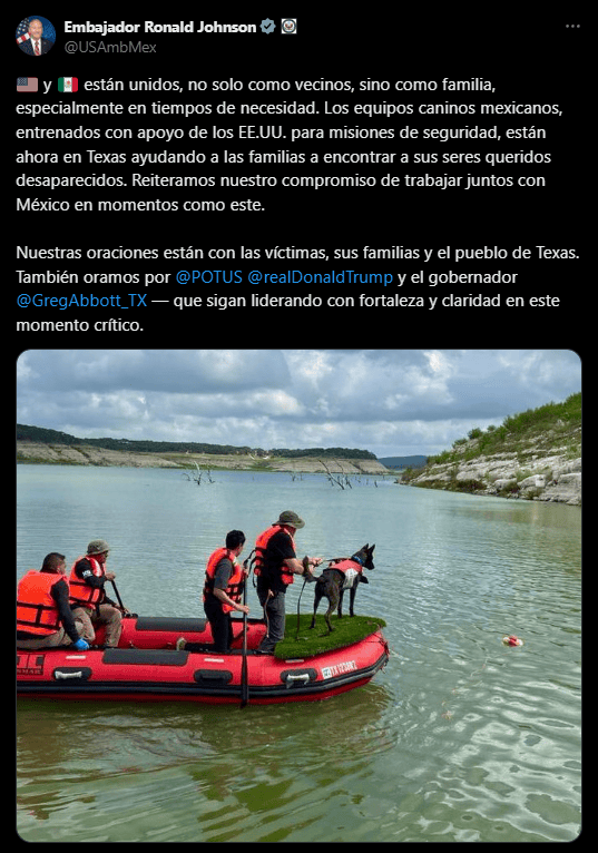 Estos equipos, especializados en la localización de restos humanos, se encontraban en Texas como parte de un curso de recuperación en cuerpos de agua, coordinado por la embajada de Estados Unidos en México. Al declararse el estado de desastre, las autoridades estadounidenses solicitaron su colaboración inmediata.