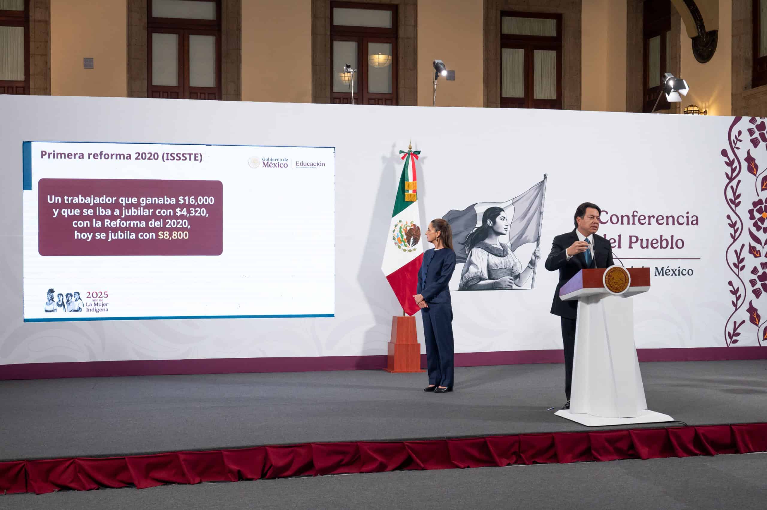 "El Fondo de Pensiones para el Bienestar regresa a un régimen solidario en una buena parte porque el Estado mexicano le garantiza a la maestra, al maestro, al trabajador del Estado y al trabajador que está afiliado al Instituto Mexicano del Seguro Social, que si gana el equivalente al salario medio del IMSS no se va a ir con menos pensión, se va a ir completo su salario.