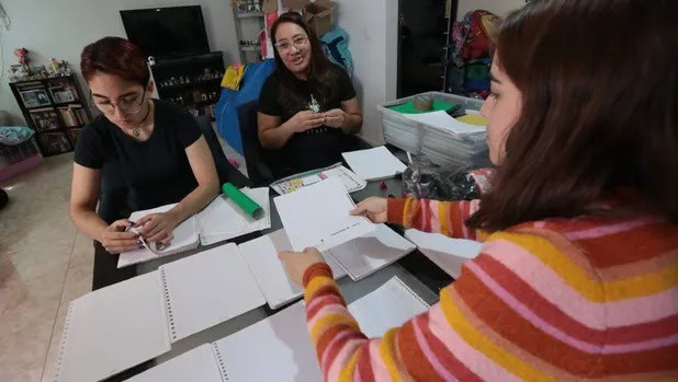 El proceso es meticuloso: recolectan libretas en centros de acopio, seleccionan hojas en buen estado, borran marcas, agrupan por tamaño y perforación, colocan arillos nuevos y decoran las pastas con papel de colores y calcomanías. Cada libreta restaurada lleva consigo no solo papel, sino esperanza.