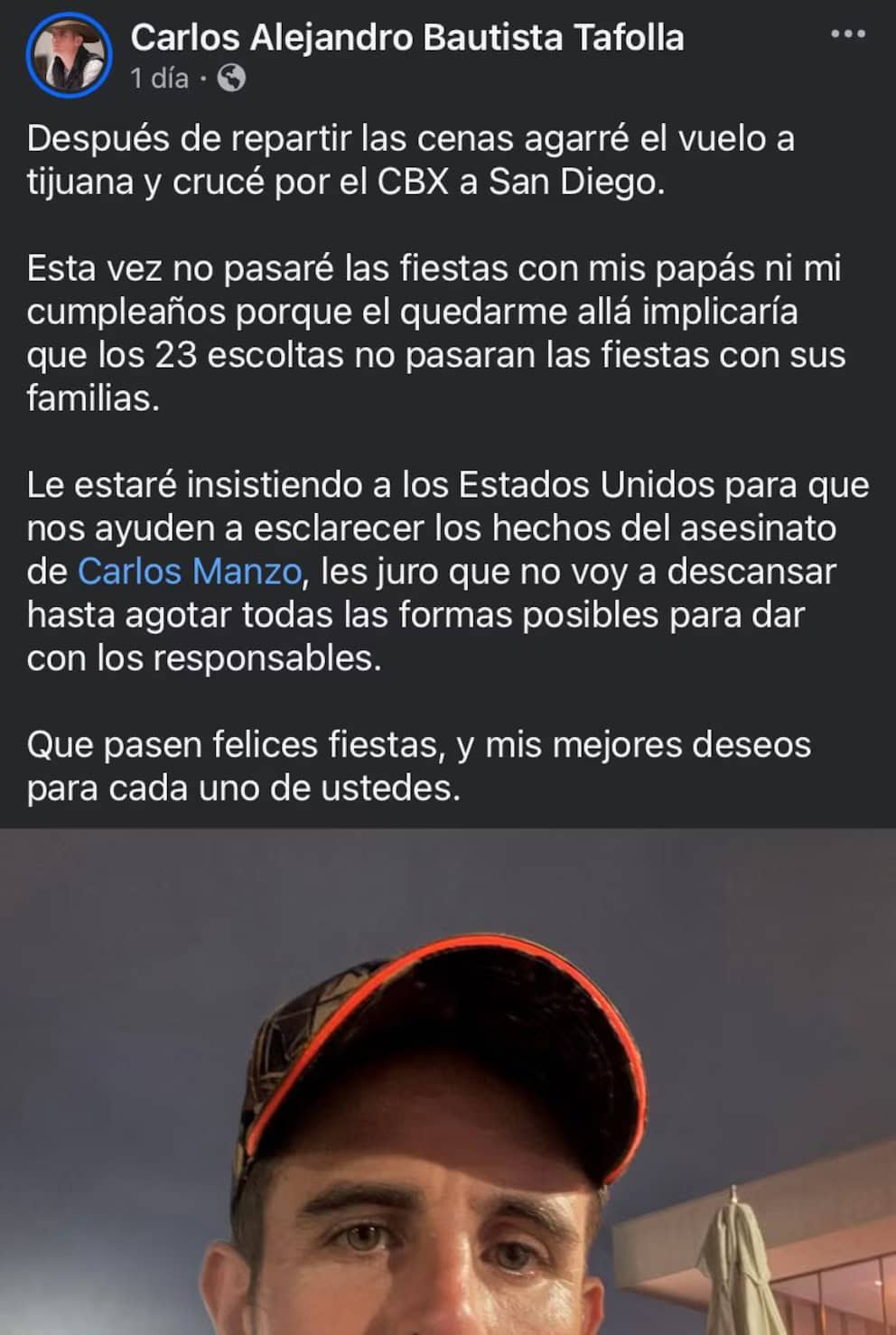 • Desde San Diego, California, el legislador —afín al llamado Movimiento del Sombrero— afirmó que insistirá ante instancias de Estados Unidos para que se sumen a las investigaciones, aunque no precisó qué dependencias serían contactadas ni el tipo de apoyo que buscará. En un mensaje difundido en redes sociales, aseguró que agotará todas las vías posibles para evitar que el crimen quede impune.