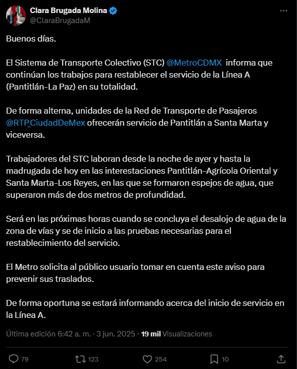 La jefa de Gobierno, Clara Brugada, comunicó a través de sus redes sociales que unidades de la Red de Transporte de Pasajeros están brindando apoyo para cubrir el trayecto entre Pantitlán y Santa Marta en ambos sentidos, mientras continúan los trabajos de desagüe.
