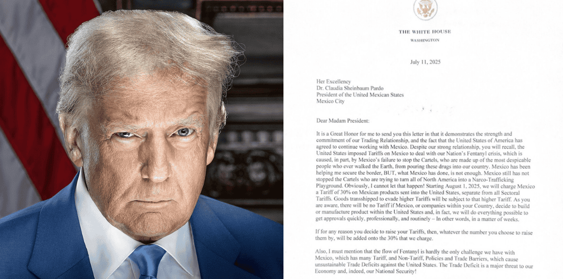 El presidente de Estados Unidos, Donald Trump, notificó este sábado 12 de julio a la presidenta Claudia Sheinbaum su decisión de imponer un arancel del 30% a los productos mexicanos que ingresen al mercado estadounidense, a partir del 1 de agosto de 2025.