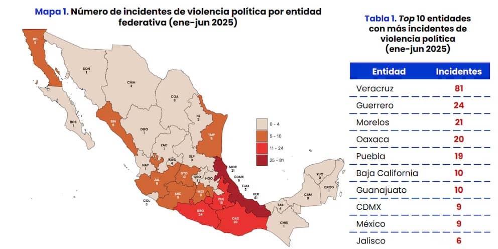 Un informe semestral de la consultora Integralia reveló que durante los primeros seis meses del año se registraron 253 casos de violencia política en México, incluyendo 112 asesinatos, 74 amenazas, 33 atentados armados, 17 secuestros y 11 desapariciones.