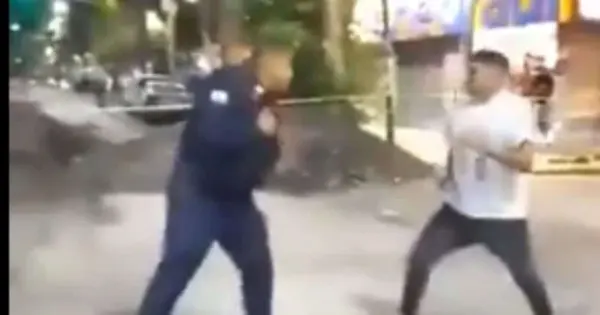 La pelea, captada en video, generó reacciones divididas en redes sociales. El motociclista fue sometido por refuerzos tras derribar al oficial.