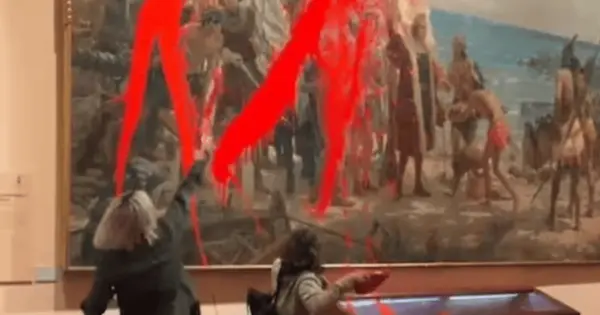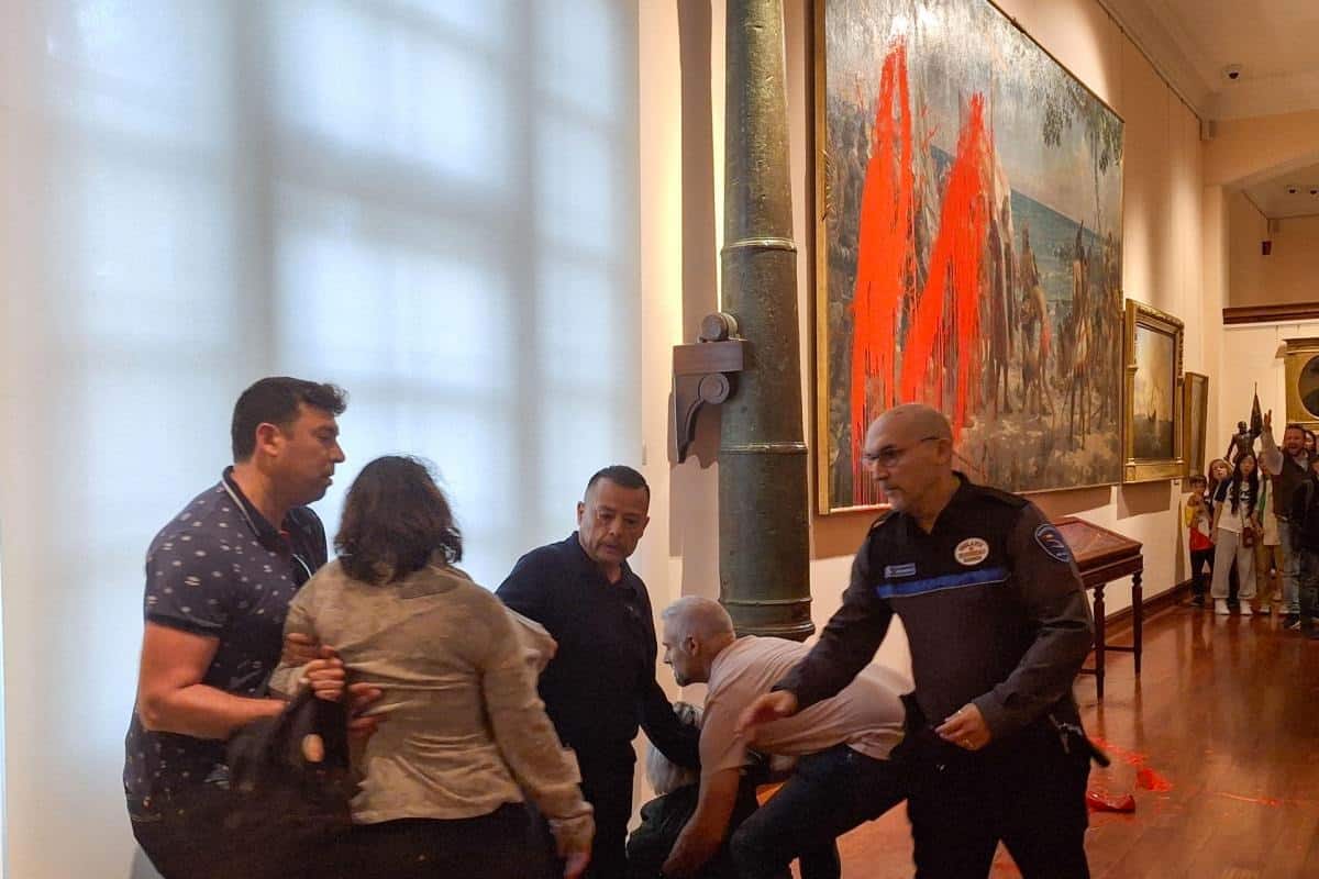 Dos integrantes de Futuro Vegetal lanzaron pintura roja biodegradable sobre la obra de José Santiago Garnelo y Alda en protesta por la Conquista.