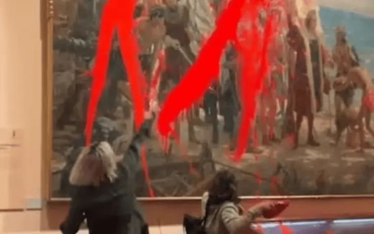Dos integrantes de la plataforma ambiental Futuro Vegetal lanzaron pintura roja biodegradable sobre el cuadro "Primer homenaje a Cristóbal Colón", obra de José Santiago Garnelo y Alda (1892), expuesta en el Museo Naval de Madrid.