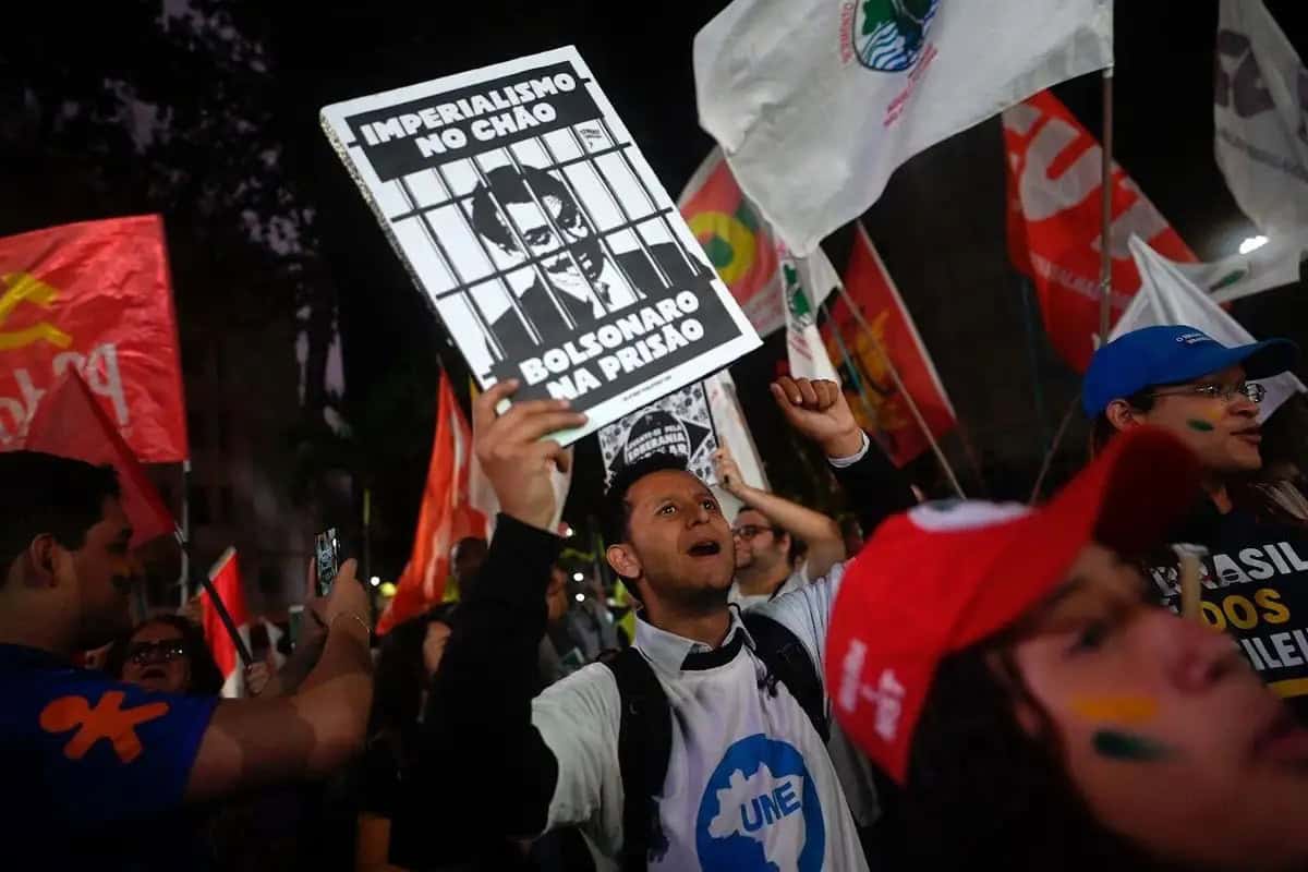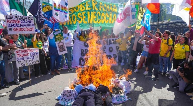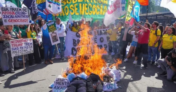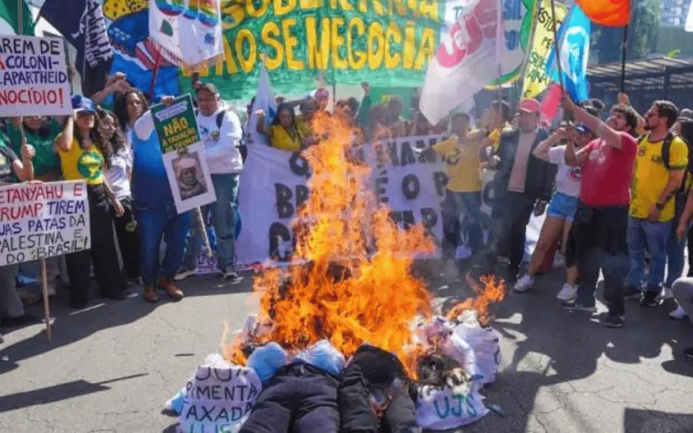 En São Paulo, manifestantes se reunieron frente al consulado estadounidense en defensa de la soberanía nacional. Durante la protesta, quemaron figuras representando a Trump y Bolsonaro.
