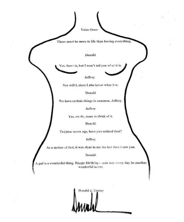 - La misiva incluye un dibujo a mano del contorno de una mujer desnuda con curvas, atribuido a Trump, aunque él ha negado haberlo escrito o creado.