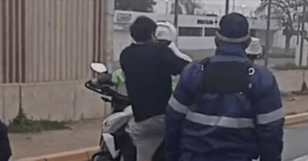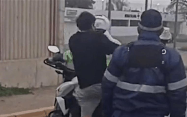 Pareciera que el elemento de seguridad, quien estaba a bordo ya de la moto, lo estuviese esperando sólo para que se subiera y arrancar, ya que la acción duró algunos segundos.