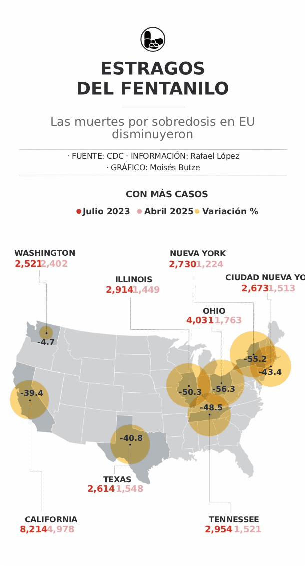 Los descensos se reflejan en varios estados: California pasó de 8,214 muertes en 2023 a 4,978 en 2025 (-39.4%); Ohio redujo 56.3% sus casos; Illinois, Nueva York, Tennessee y Texas también reportaron bajas significativas. Wyoming, Arkansas, Virginia, Virginia Occidental y Michigan registraron reducciones superiores al 57%, consolidando la tendencia nacional a la baja.