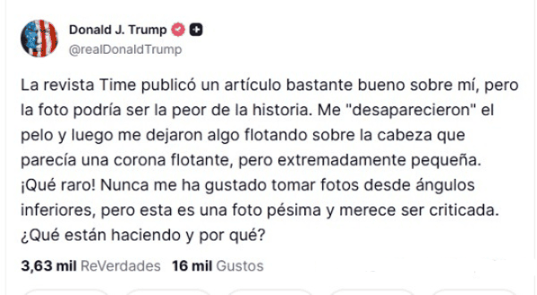 El presidente de Estados Unidos, Donald Trump, expresó su descontento con la fotografía utilizada por la revista Time en su más reciente portada. Aunque reconoció que el artículo sobre él era positivo, calificó la imagen como "una de las peores de la historia".