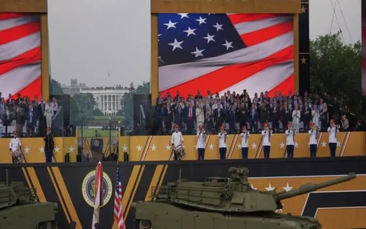 El evento comenzó con una exhibición aérea: paracaidistas descendieron sobre el Mall, uno de ellos entregó una bandera al presidente. Siguió una representación poco habitual en territorio estadounidense: un desfile con soldados vestidos con uniformes históricos conmemorativos, evocando momentos clave del ejército a lo largo de sus dos siglos y medio.