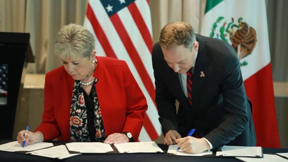 La secretaria de Medio Ambiente y Recursos Naturales (Semarnat), Alicia Bárcena, y el titular de la Agencia de Protección Ambiental de Estados Unidos (EPA, por sus siglas en inglés), Lee Zeldin, encabezaron la ceremonia de firma, con la participación del embajador estadounidense en México, Ronald Johnson.