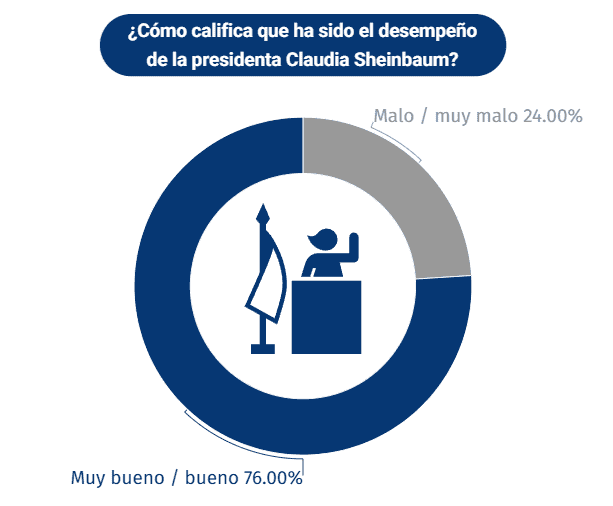- Claudia Sheinbaum Pardo, la primera mujer en presidir México, mantiene una aprobación histórica al cumplir siete meses en el cargo, superando a sus antecesores de las últimas tres décadas, según una encuesta de FactoMétrica y Reporte Índigo. El 76 % de los mexicanos califica su gestión como buena o muy buena, destacando su desempeño en seguridad, combate a la pobreza y lucha contra la corrupción.