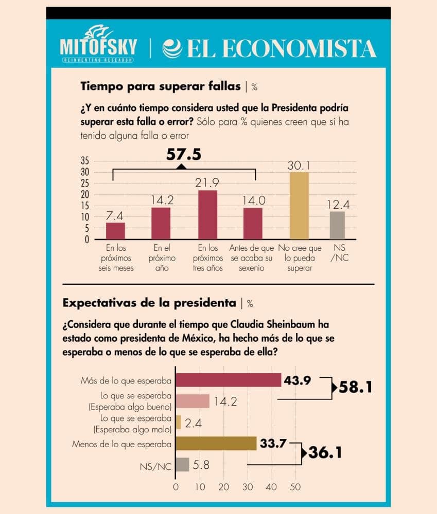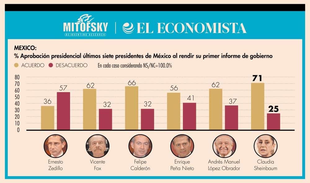- Por otro lado, la encuesta también reveló que el nivel de aprobación de Sheinbaum se encuentra por arriba de los últimos presidentes de cara a rendir su primer informe de gobierno. Con su antecesor, la diferencia es de nueve puntos, pues en ese momento el aval de Andrés Manuel López Obrador era de 62 por ciento.