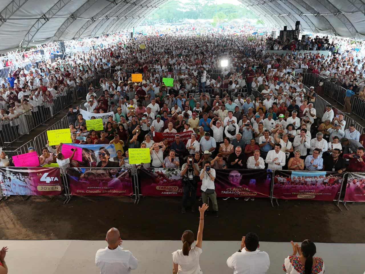 Ante 25 mil personas reunidas en Villahermosa, la mandataria destacó que 739 mil 579 tabasqueñas y tabasqueños reciben apoyos del Bienestar, con una inversión anual de 21 mil 261 millones de pesos.