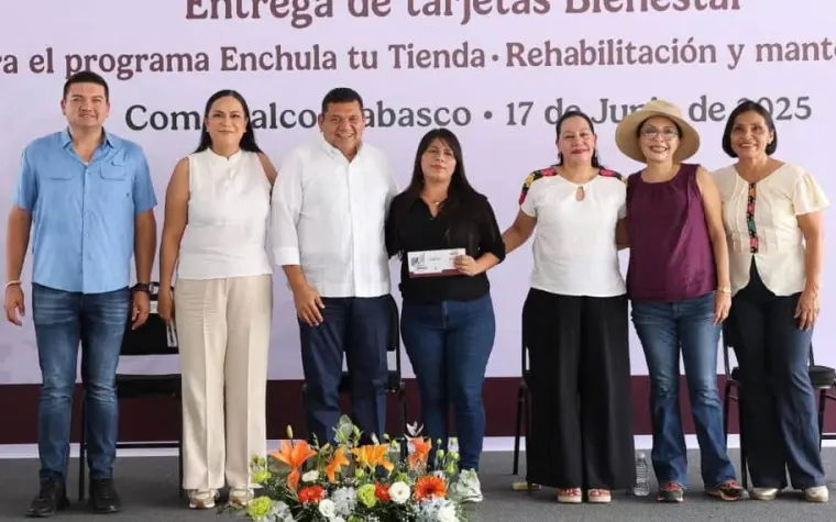 En Villa Aldama, Comalcalco, el mandatario, acompañado por la secretaria de Bienestar federal, Ariadna Montiel Reyes, y la directora de Alimentación para el Bienestar, María Luisa Albores González, entregaron las primeras 66 tarjetas del programa "Enchula tu Tienda".