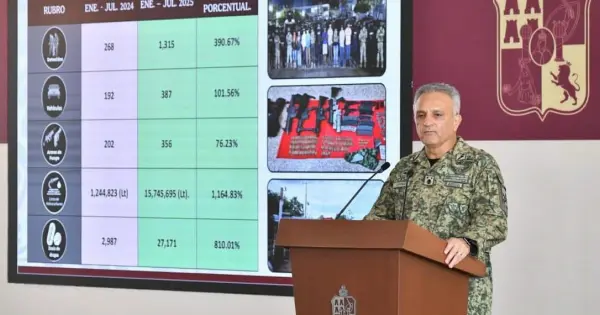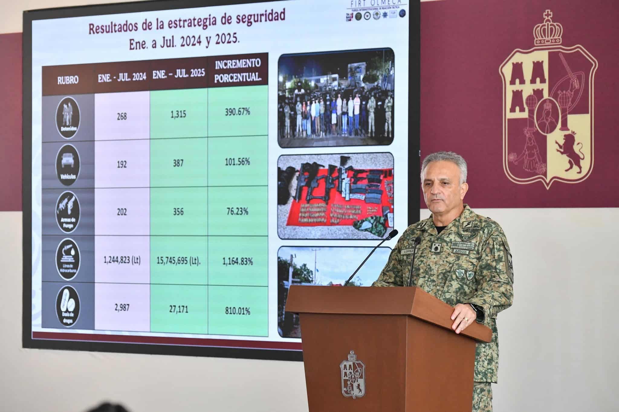 En la conferencia de prensa de Palacio de Gobierno, en la que se presentó el nuevo informe de seguridad, López Martínez agregó que en los primeros siete meses del 2025 las fuerzas de seguridad pública federales y estatales aseguraron 356 armas de fuego, un incremento anual de 76.23%.