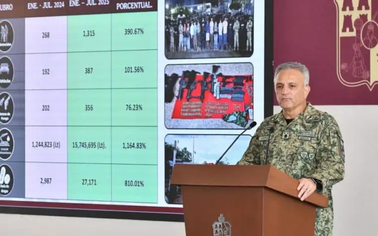 - Además, se decomisaron 15 millones 745 mil 695 litros de combustible robado a Petróleos Mexicanos (PEMEX) en el periodo enero-julio de este año, un alza de mil 164% respecto a los primeros siete meses del 2024.