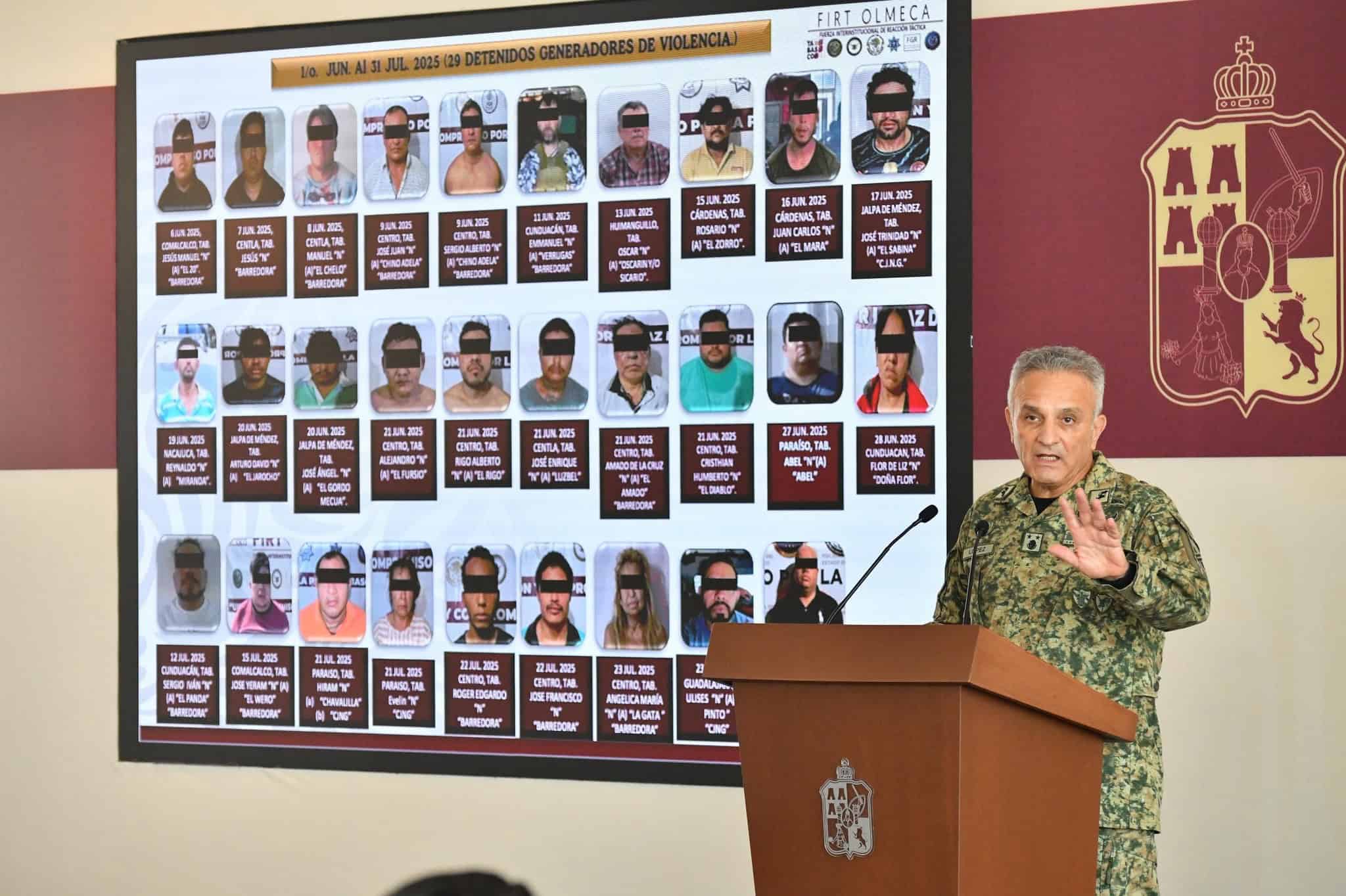 - El comandante de la 30 Zona Militar de la Secretaría de la Defensa Nacional, Miguel Ángel López Martínez, señaló que en el periodo enero-julio de este año las fuerzas de seguridad pública de los gobiernos federal y estatal detuvieron a mil 315 delincuentes en Tabasco, la mayoría de ellos generadores de violencia.
