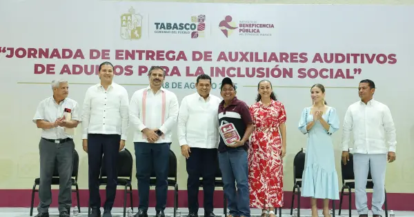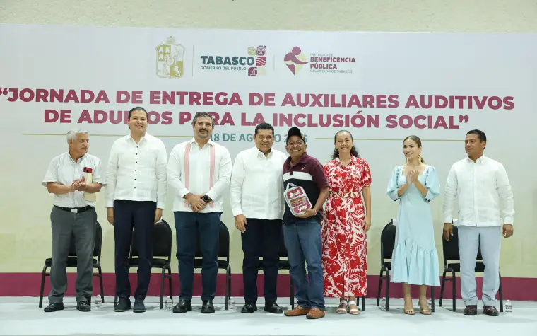 - En una ceremonia efectuada en el Centro de Convenciones Tabasco 2000, el mandatario estatal subrayó que la justicia social parte de reconocer que la salud debe entenderse desde un enfoque de inclusión y autonomía, por lo que, del 18 al 22 de agosto, a través del Instituto de la Beneficencia Pública se entregarán 500 auxiliares auditivos completamente gratuitos a igual número de personas de los 17 municipios.
