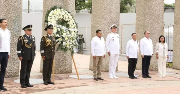 Autoridades estatales, municipales y militares hicieron entrega de la ofrenda floral, durante el evento en el que estuvo también el comandante de la Tercera Región Naval, Juan Carlos Vera Salinas, e integrantes de la Mesa para la Construcción de la Paz y Seguridad.