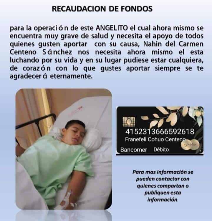 Añadieron que el menor de nombre Nahin del Carmen Centeno Sánchez, se encuentra en estos momentos hospitalizado en Mérida, Yucatán, a causa de un tumor, el cual hasta el momento desconocen si es cancerígeno.