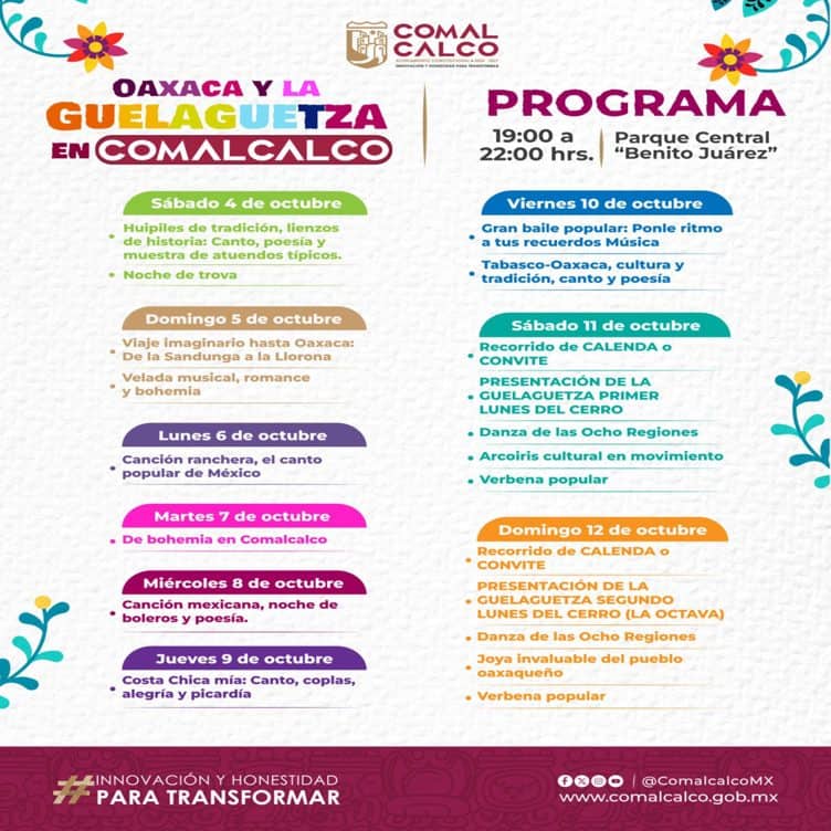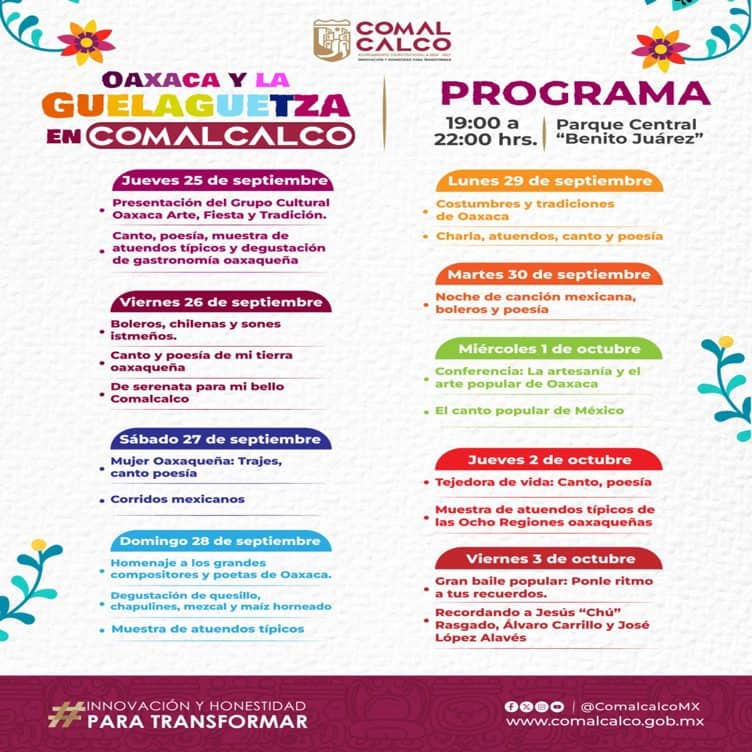 Del jueves 25 de septiembre y hasta el próximo 12 de octubre, las familias comalcalquenses y visitantes podrán disfrutar una experiencia única con lo mejor de la cultura, artes, tradiciones, gastronomía y artesanía oaxaqueña, a través de una extensa y variada cartelera artística.