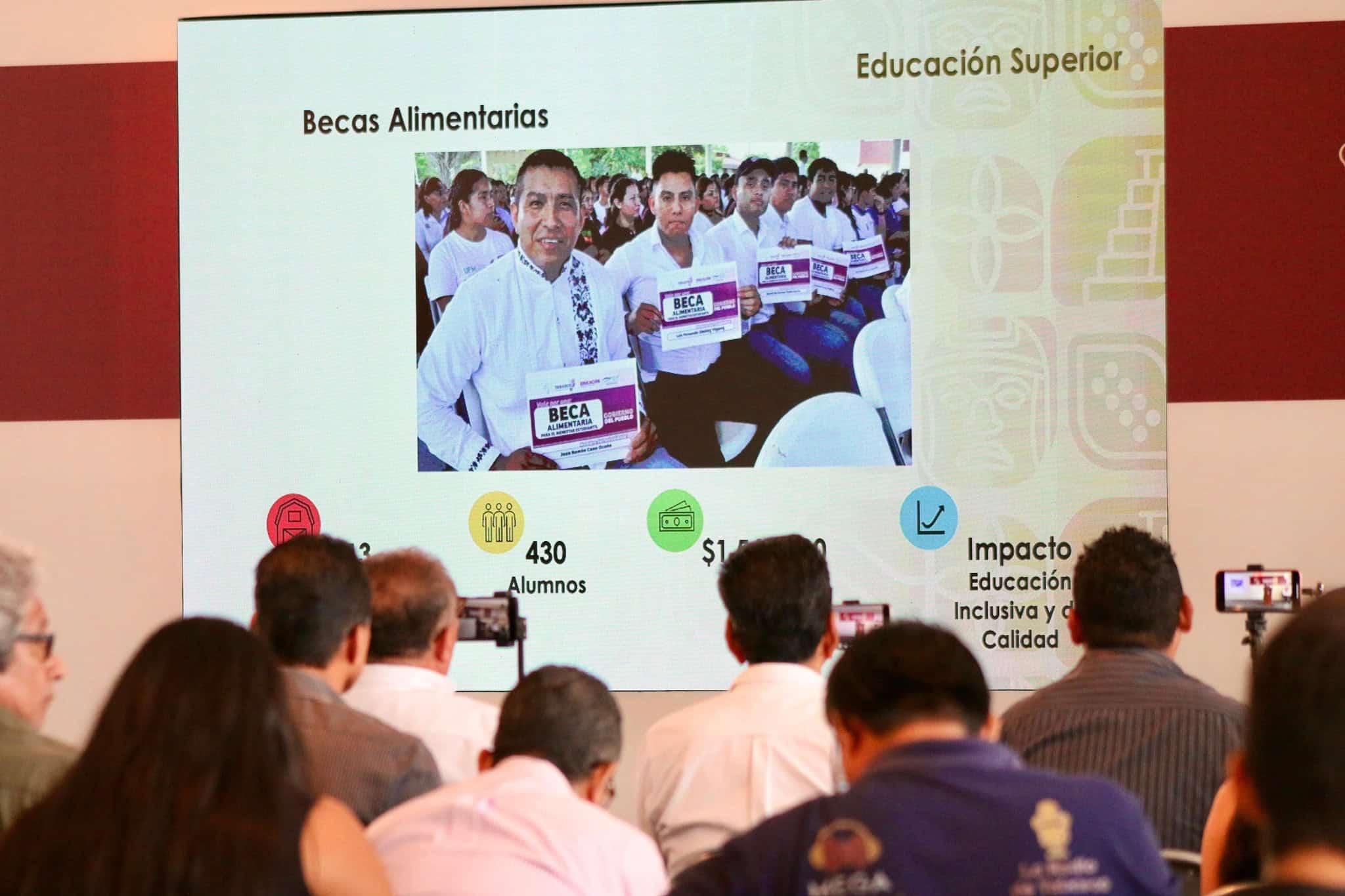 Sobre el programa de Becas Alimentarias para el Bienestar, afirmó que actualmente opera en tres instituciones de educación superior, beneficiando a un total de 430 alumnos con una inversión de un millón 548 mil.