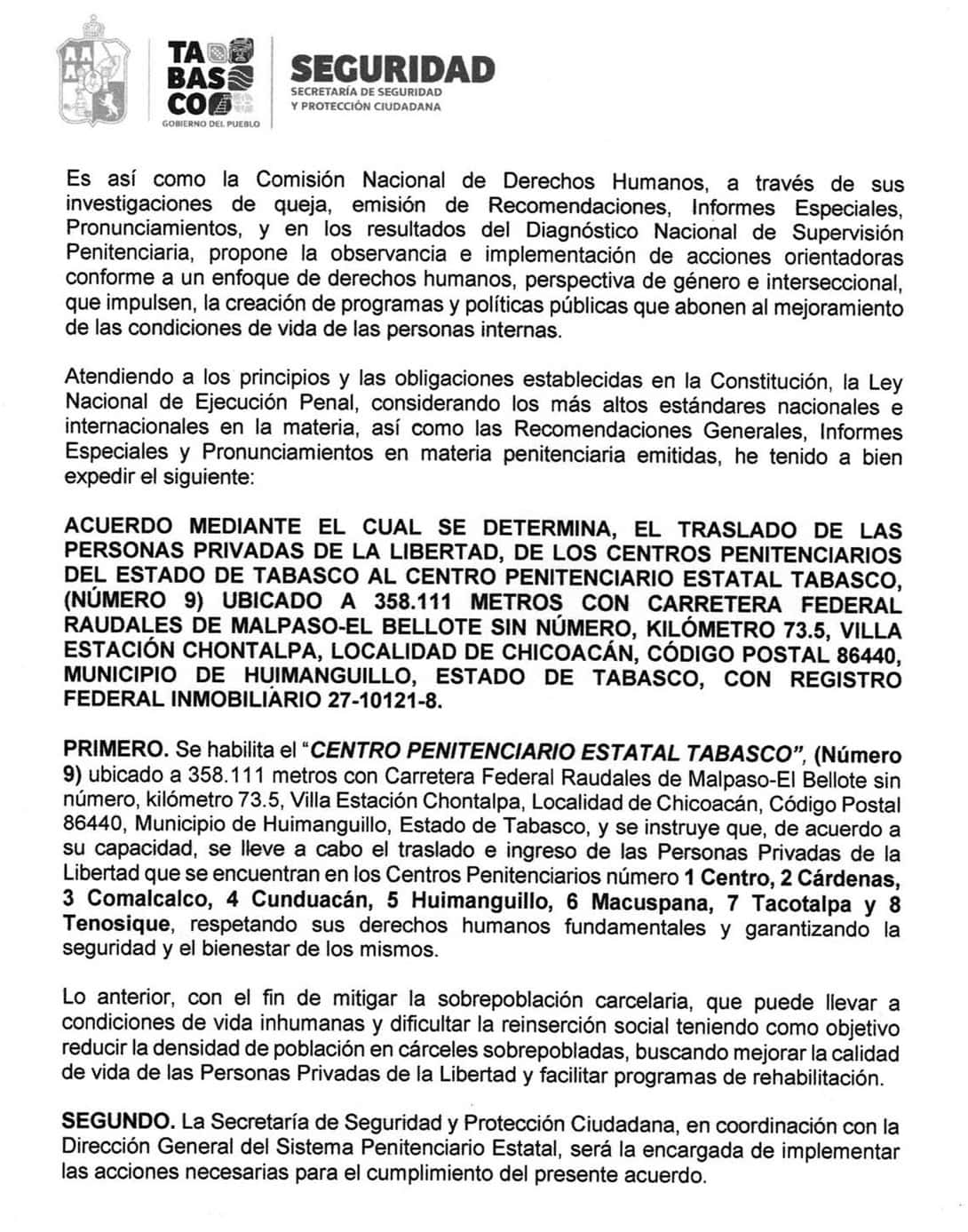 "Y se instruye que de acuerdo a su capacidad, se lleve a cabo el ingreso de las Personas Privadas de la Libertad que se encuentran en los centros penitenciarios número 1 Centro, 2 Cárdenas, 3 Comalcalco, 4 Cunduacán, 5 Huimanguillo, 6 Macuspana, 7 Tacotalpa y 8 Tenosique, respetando sus derechos humanos fundamentales y garantizando la seguridad y el bienestar de los mismos", señala el punto primero del acuerdo.