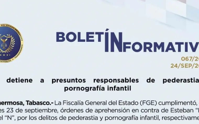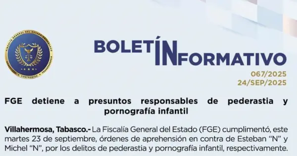 La Fiscalía General del Estado (FGE) cumplimentó, este martes 23 de septiembre, órdenes de aprehensión en contra de Esteban "N" y Michel "N", por los delitos de pederastia y pornografía infantil, respectivamente.