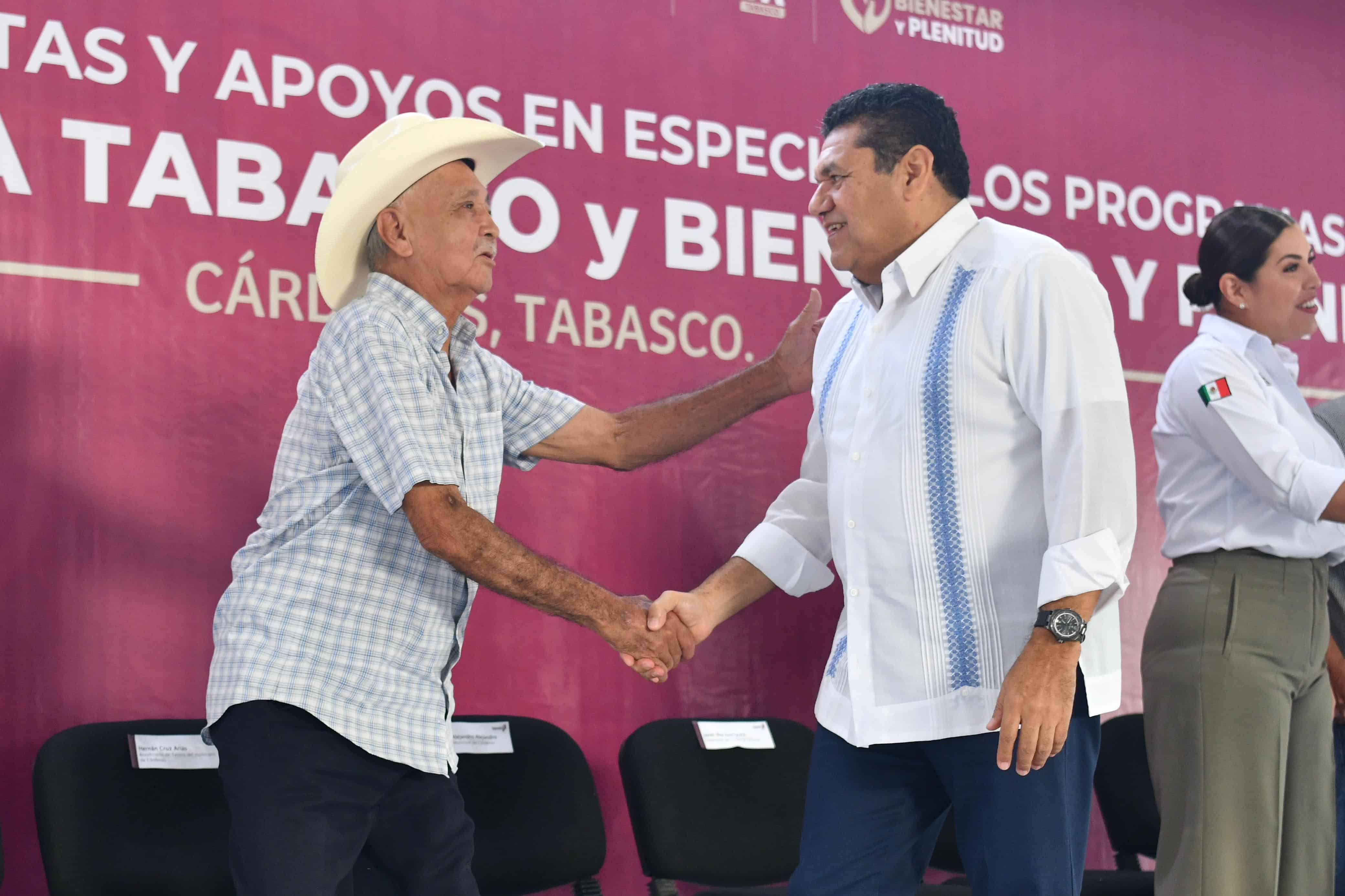 El Gobernador Javier May Rodriguez encabezó la entrega de 2 mil 247 tarjetas a beneficiarios de los programas ‘Sembrando Vida Tabasco’ y ‘Bienestar y Plenitud’ de Cárdenas y Huimanguillo, rubros en los que se realiza una inversión social histórica