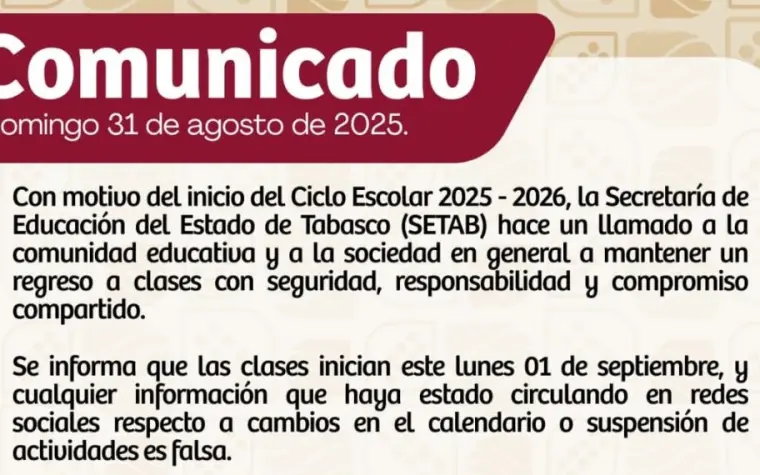 Con motivo del inicio del Ciclo Escolar 2025 - 2026, la Secretaría de Educación del Estado de Tabasco (SETAB) hace un llamado a la comunidad educativa y a la sociedad en general a mantener un regreso a clases con seguridad, responsabilidad y compromiso compartido.