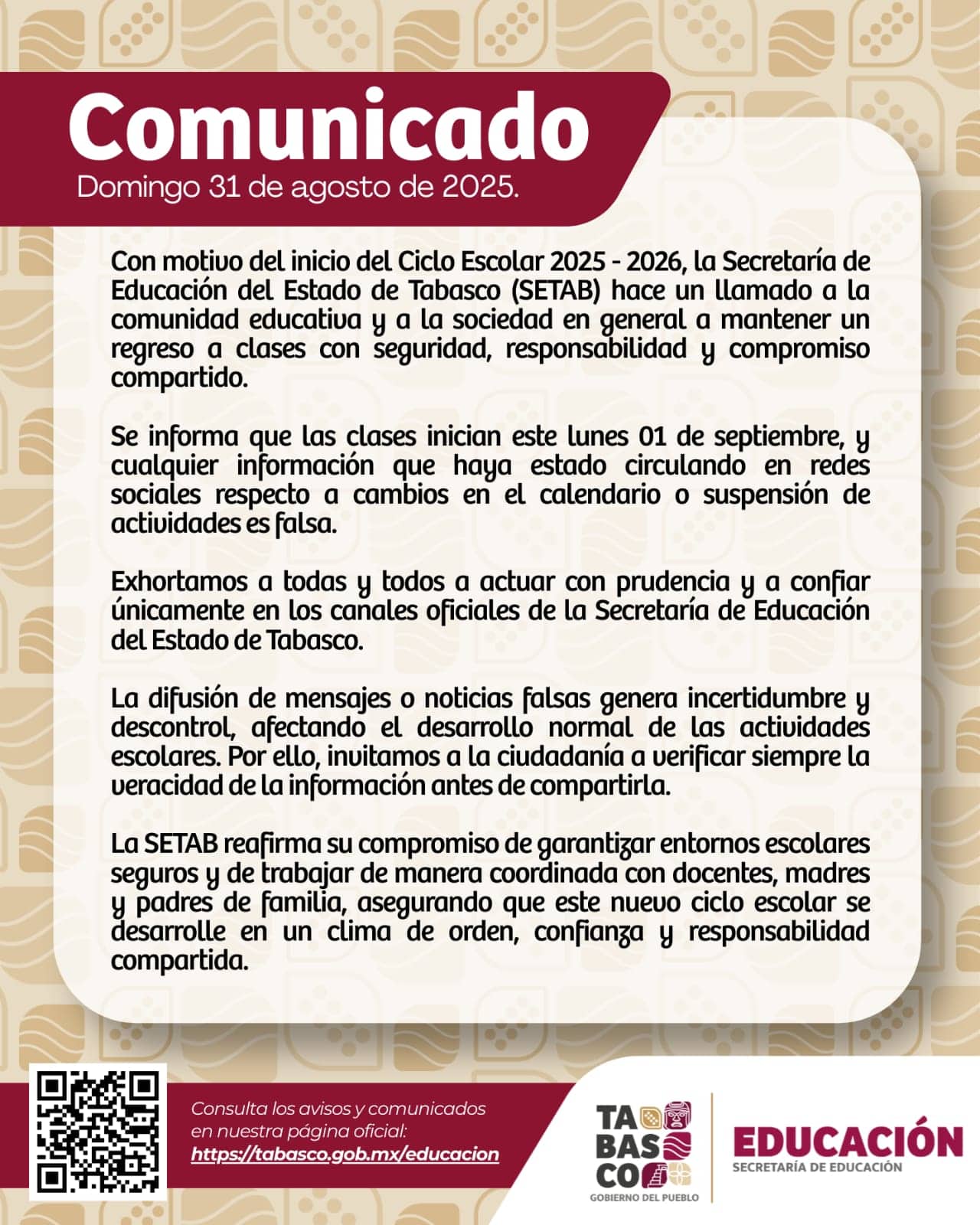 - Exhortamos a todas y todos a actuar con prudencia y a confiar únicamente en los canales oficiales de la Secretaría de Educación del Estado de Tabasco.