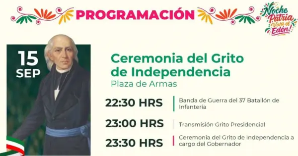La noche del 15 de septiembre la Plaza de Armas será el corazón de la verbena popular, con la participación de tamborileros, mariachis, el Ballet Folklórico del Ceiba, la Banda Sinfónica del Estado y la Banda de Guerra del 37° Batallón de Infantería.