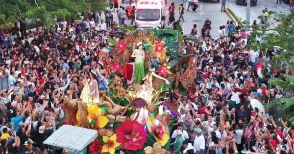 El carro alegórico adornado con garzas de petate, de guano y mariposas coloridas por diferentes granos de semillas, y con la leyenda a sus costados de "Miss Universe México 2025, Fátima Bosch" fue abordado a las 5:51 de la tarde por la también Flor Tabasco 2018.